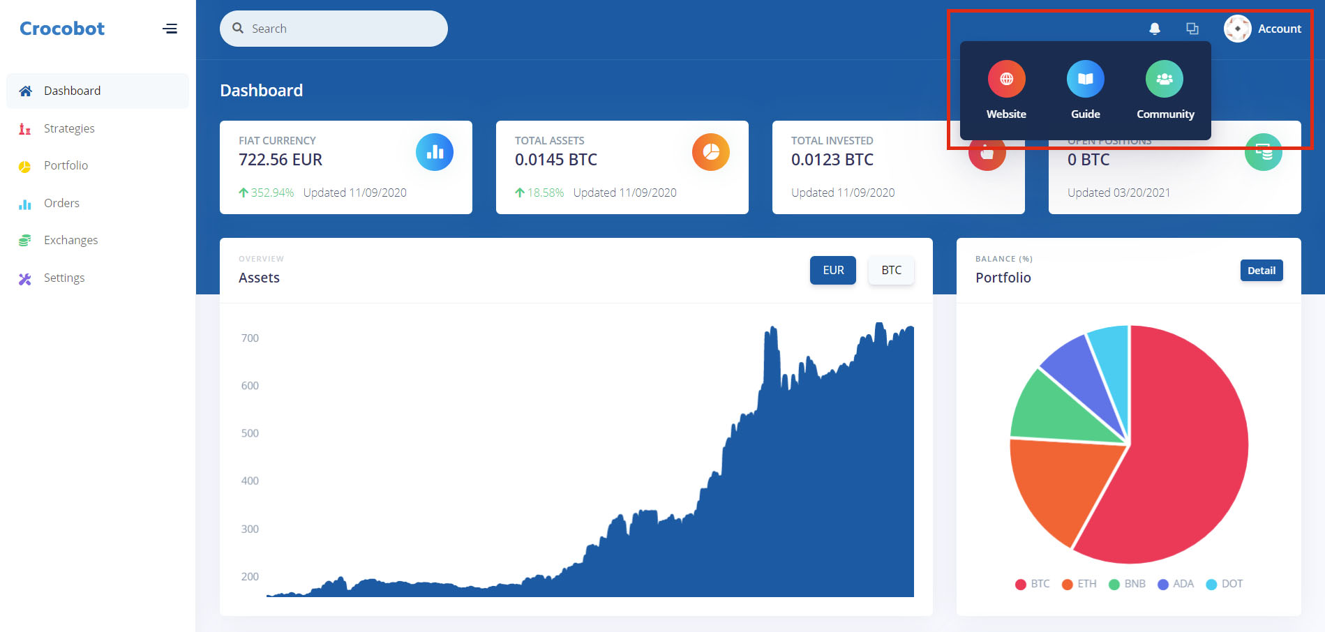 User Menu: Click on Account to manage your profil and secure your account